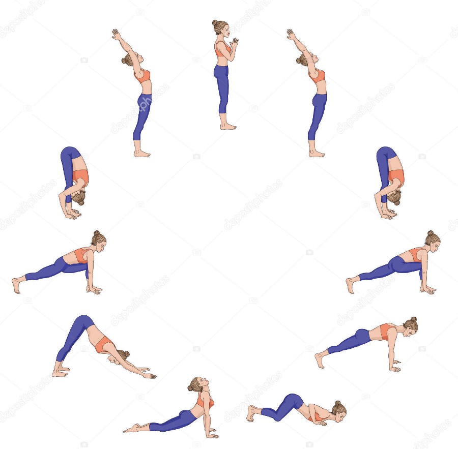 - De zonnegroet: je kunt deze serie oefeningen heel rustig op het tempo van je in- en uitademing doen. Begin bij het bovenste plaatje (op klok-positie 12 uur) en volg met de richting van de klok mee de houdingen. Bij plaatje 4 (op klok-positie 3.00 uur) stap je in de 1e ronde met je linker been naar achter en dan na de 8e houding (op klok-positie 8.00 uur) met je linker been naar voren. In de 2e ronde stap je met je rechter been respectievelijk naar achter en naar voren: